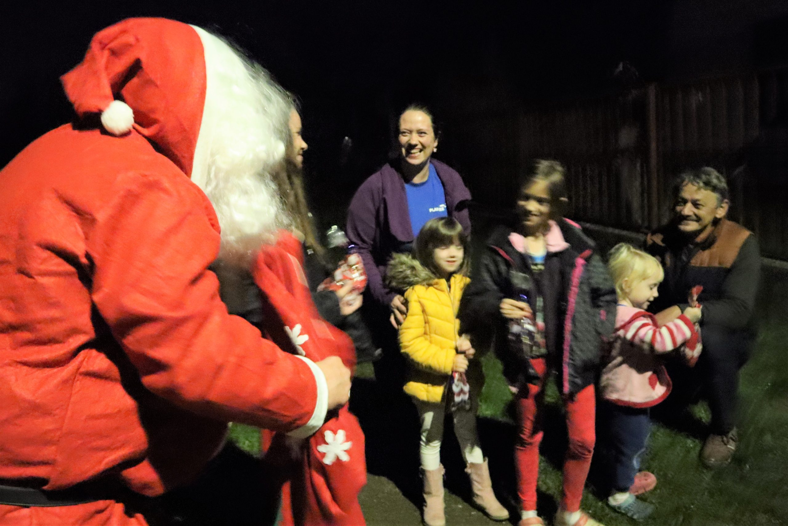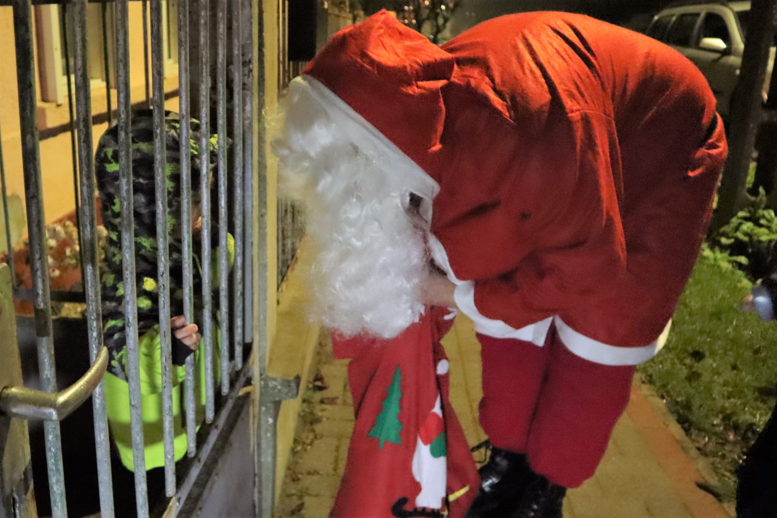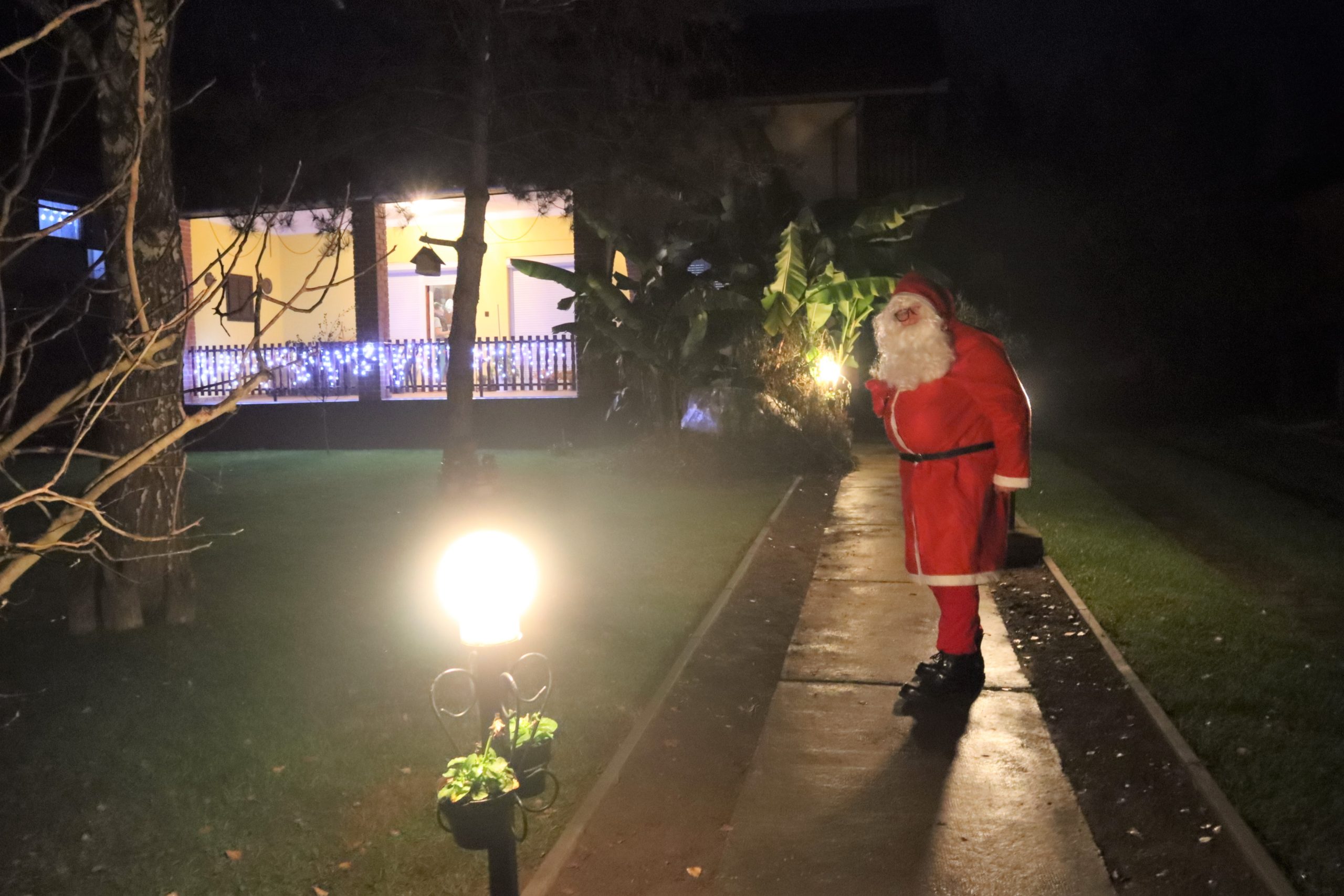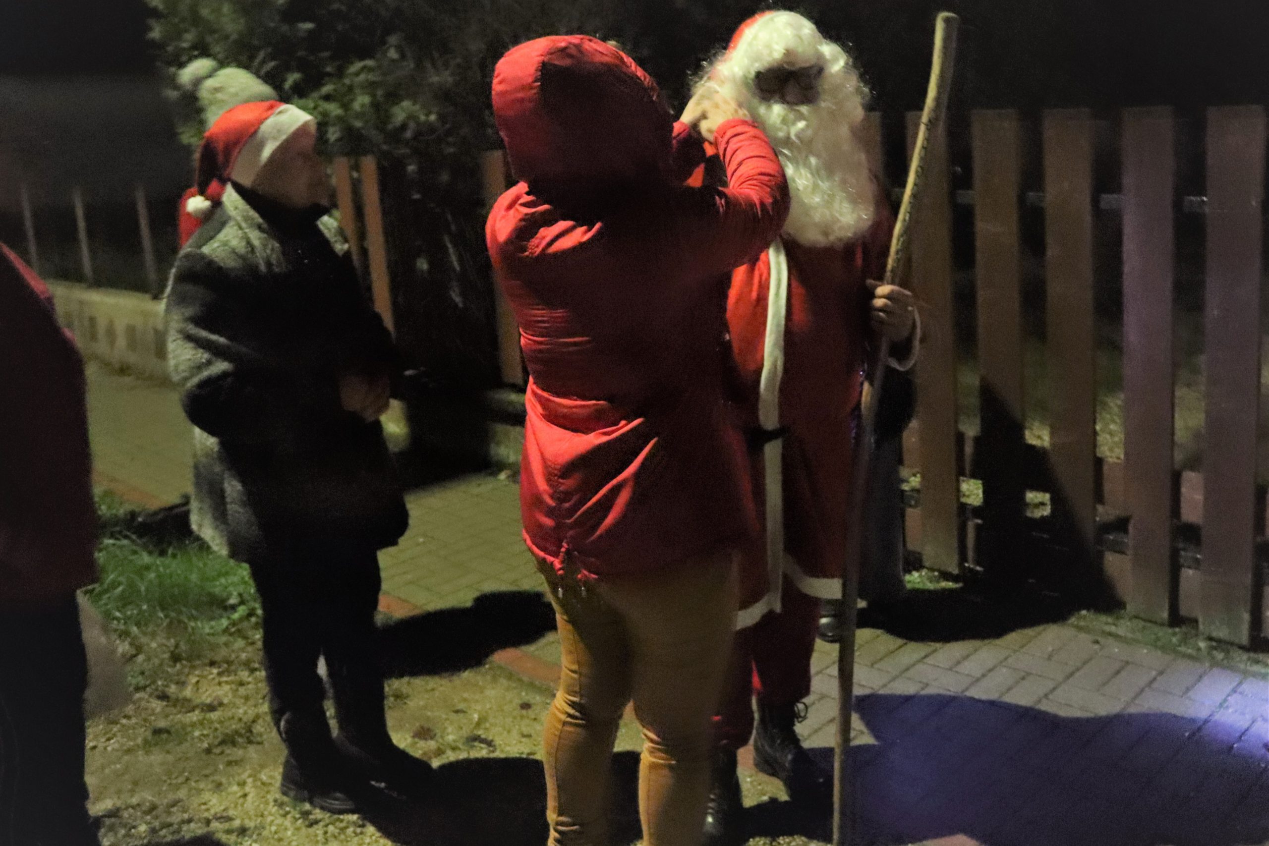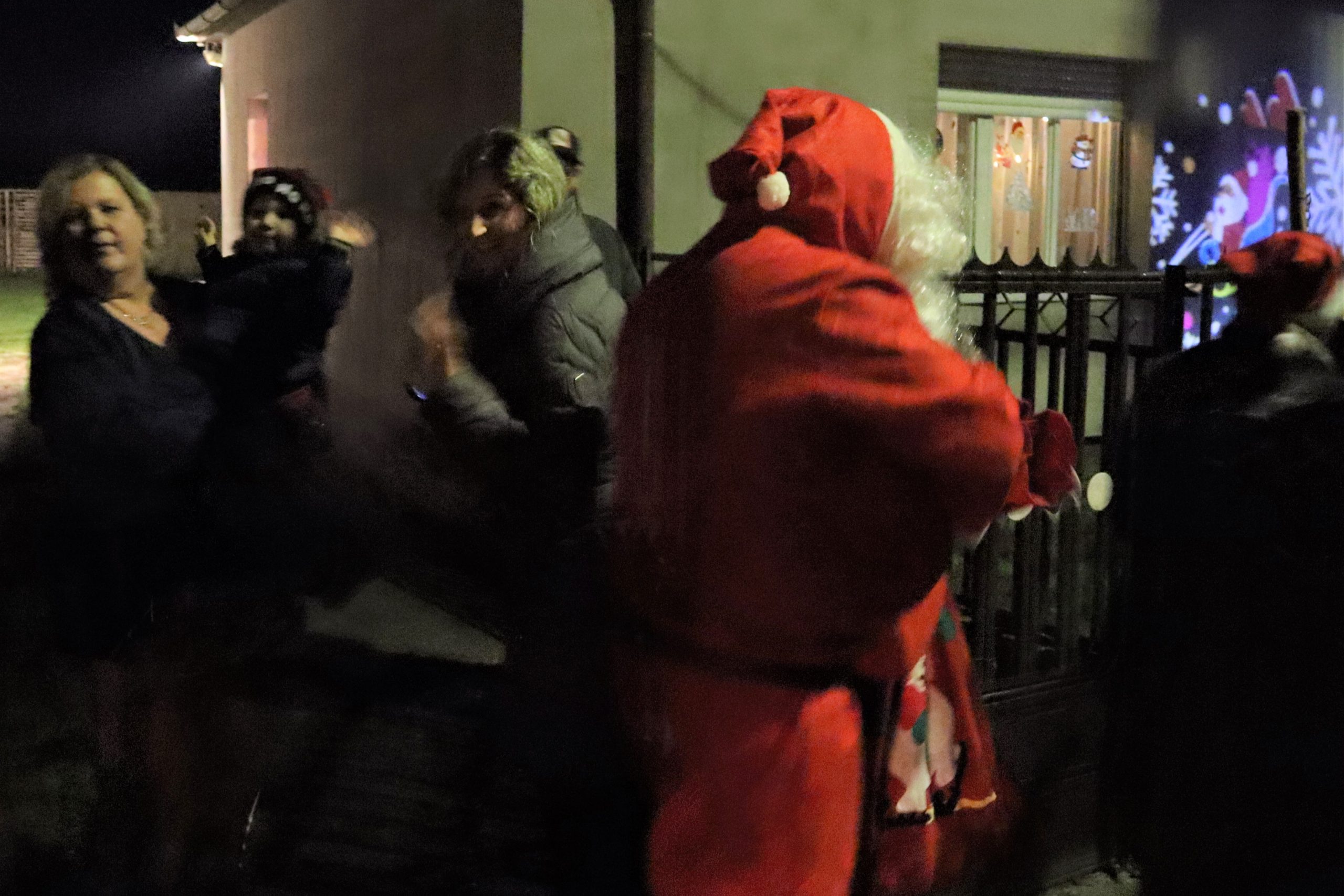 A Télapó beszállt a kisbuszba és láss csodát, néhány perc múlva a Télapó már a Nyugdíjas Klub tagjaival együtt elindulhatott az első falu szélén lévő kis házhoz.